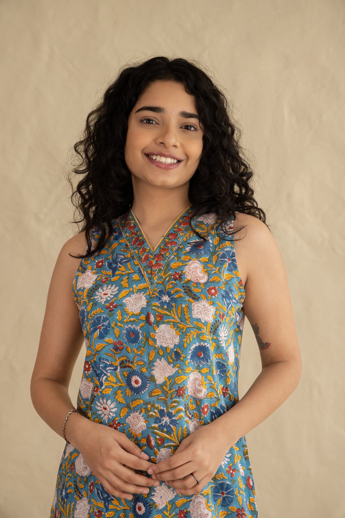 This sleeveless blue cotton kurta features intricate hand-block floral prints inspired by traditional craftsmanship. Designed with a flattering V-neckline and contrast piping, it offers a lightweight, breathable feel ideal for everyday wear, work, or summer outings. Pair it with jeans or straight pants for a stylish and comfortable Indo-contemporary look.