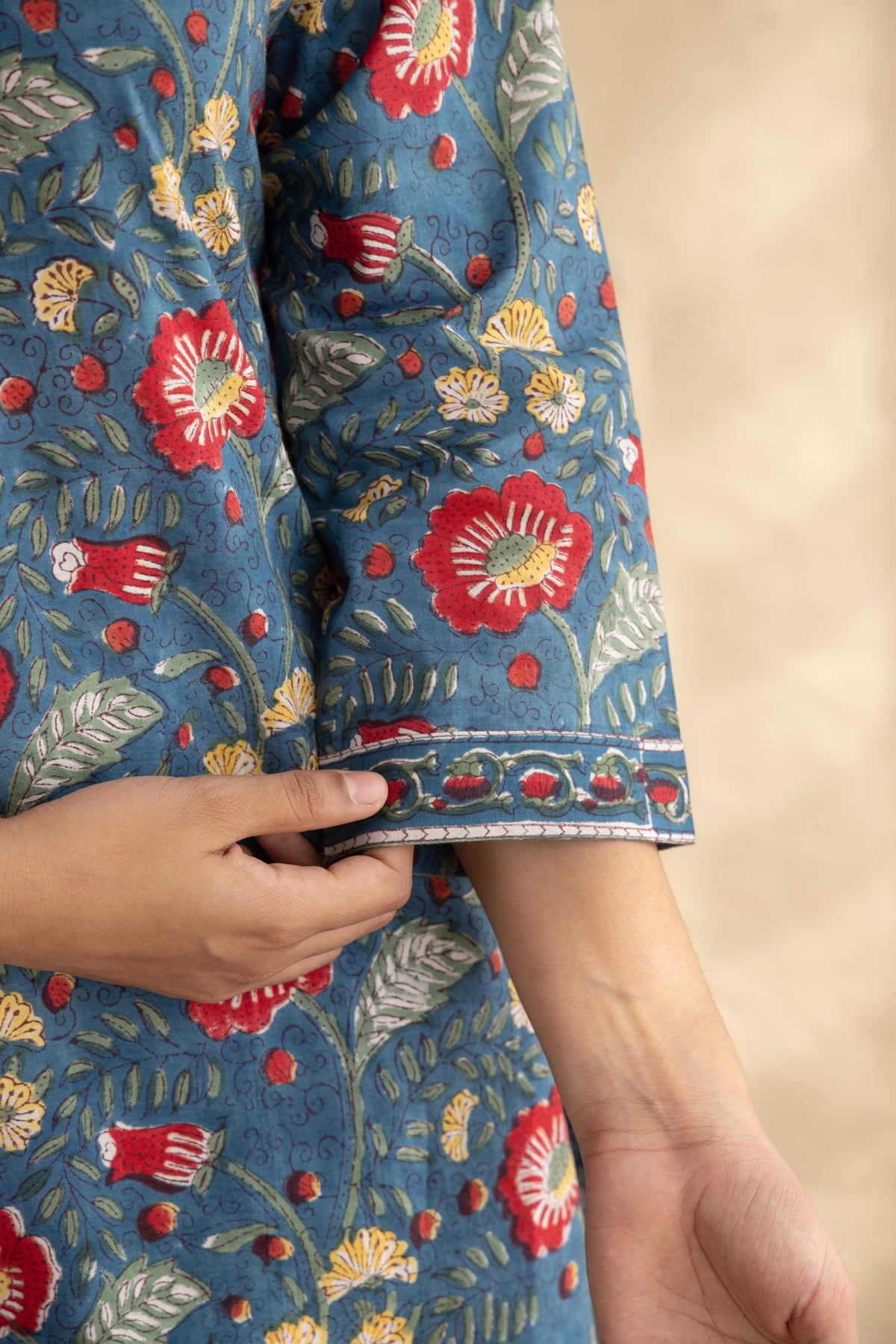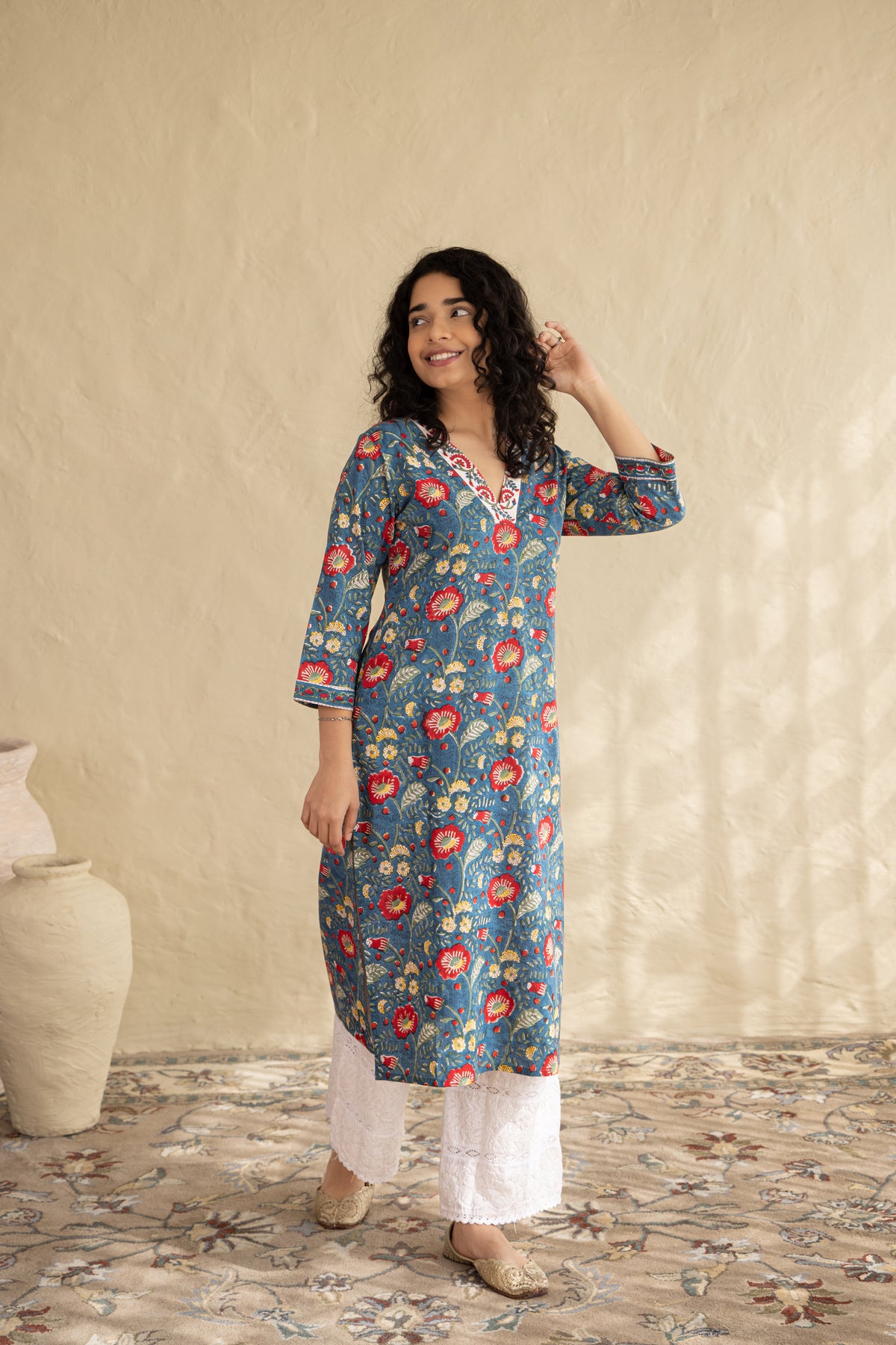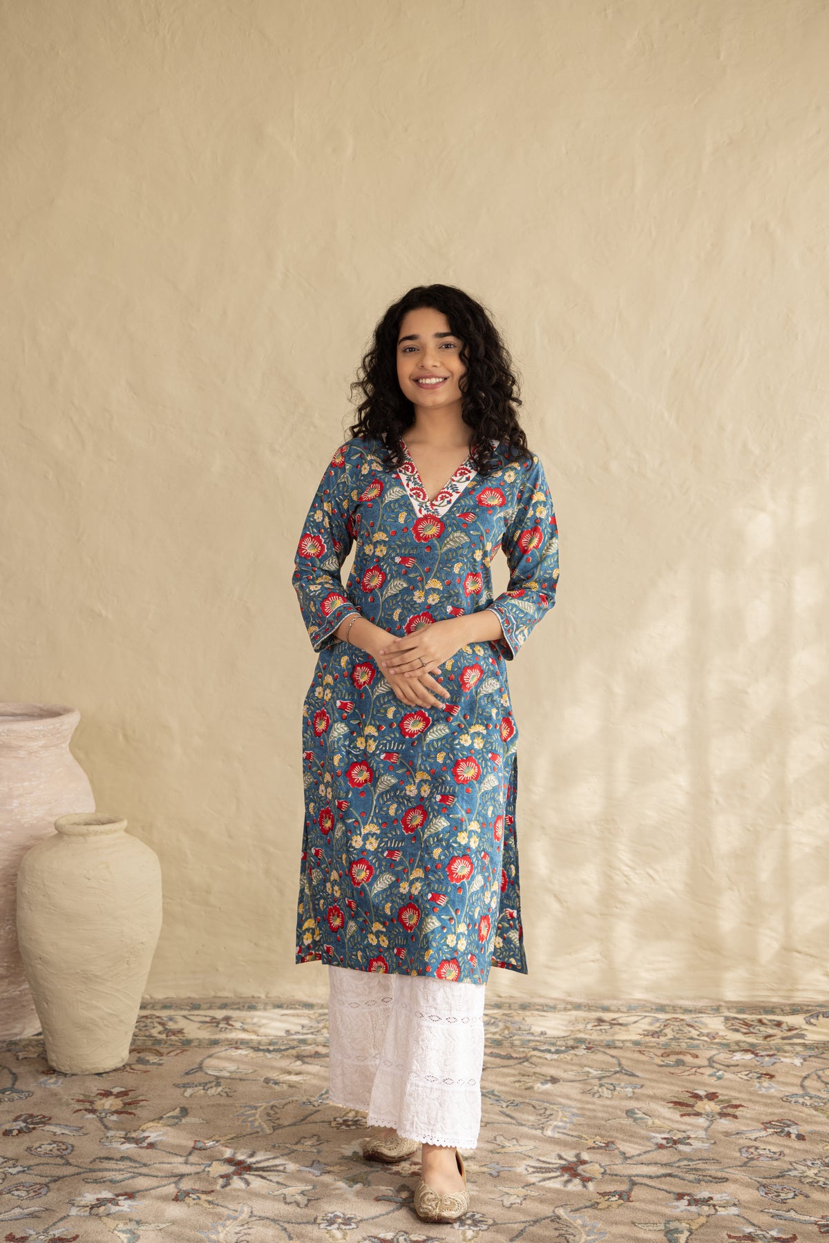 Crafted in soft, lightweight cotton, this floral block-printed kurta is designed to enhance your everyday wardrobe. Its relaxed fit and detailed neckline make it perfect for styling with linen pants or traditional leggings for a polished ethnic look.